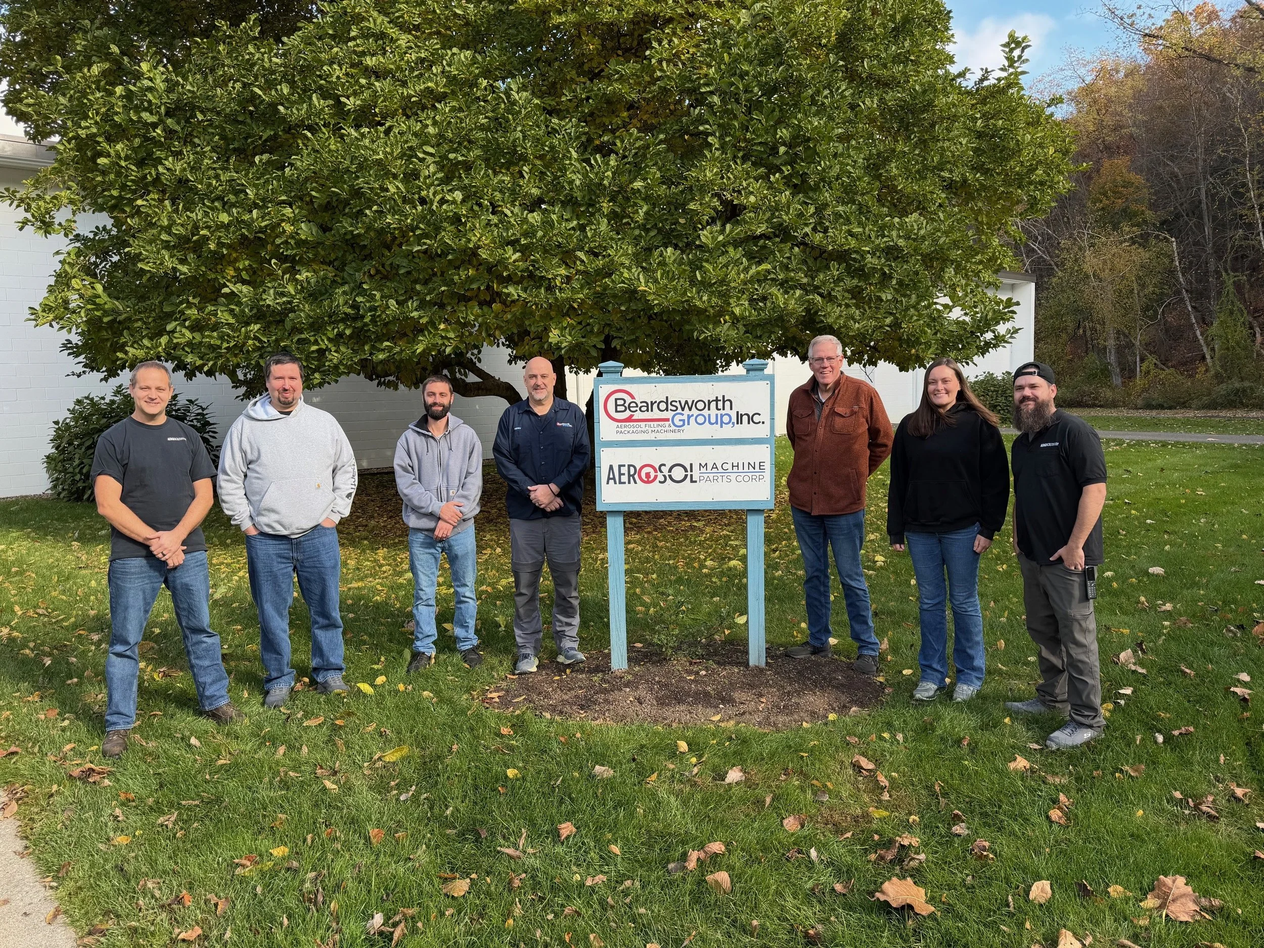 Seven people standing outside in front of a large green tree, posing with a sign for Beardsworth Group, Inc. and AeroSol Machine Parts Corp.